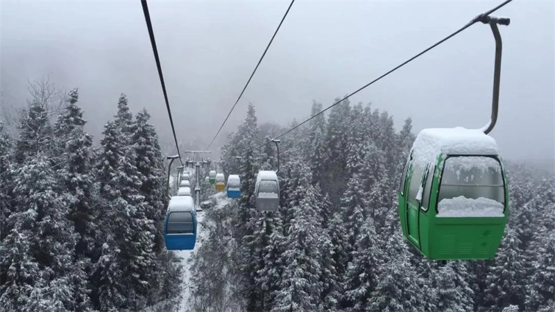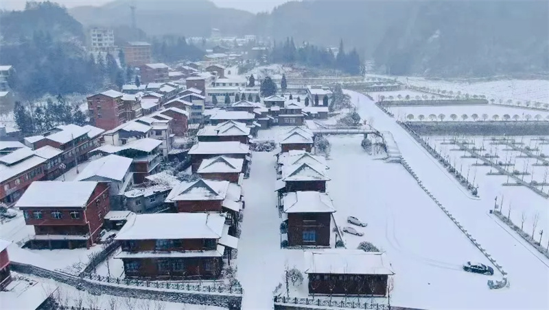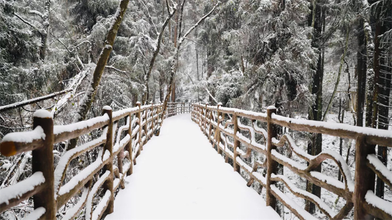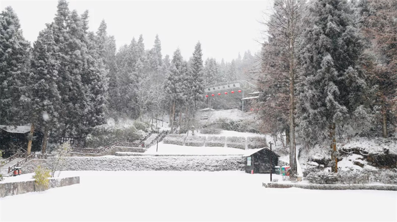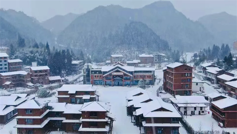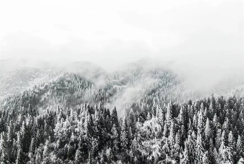 在南方,雪是物以稀为贵的存在,尽管不比“千里冰封”的北国风光,但在坪坝营,雪原、林海、民俗风情样样皆有,南国的雪与苍翠山岭相合,搭配森林酒店,电影的画面感就出来了,壮观的雪景开门就在眼前。群山逶迤,浩瀚苍茫,雪花纷纷漫漫,洁白的雪笼罩山峦奇峰,每一寸土地都变得晶莹洁白,更显娉婷秀雅,诗情画意。